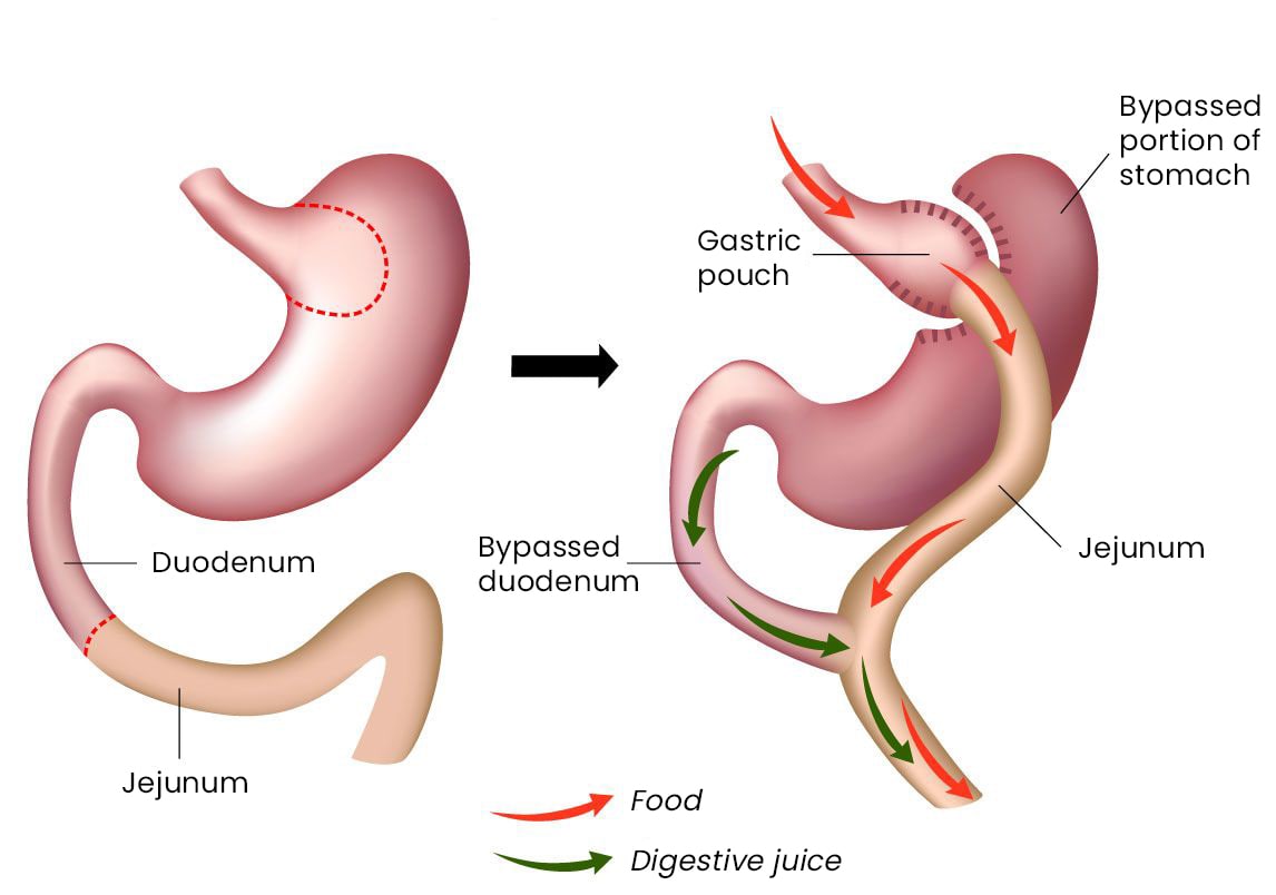 Bypass surgery consists of reducing the size of your stomach (remaining approximately your stomach the size of a golf ball) creating a bridge between the stomach and the small intestine, shortening the length of the intestine that is in contact with food which reduces the amount of food absorbed.
